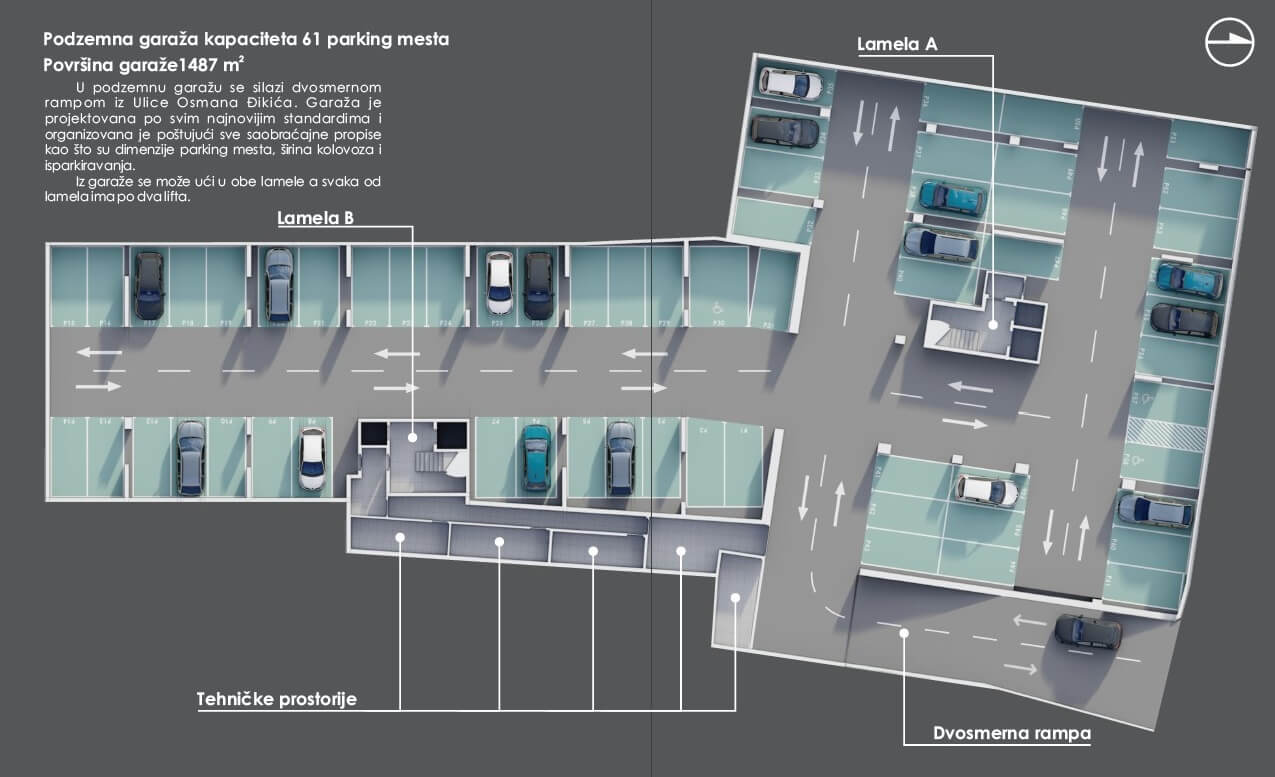 U okviru garažnog dela predviđene su 1 podzemna etaža i prizemlje, te je za svaki stan obezbeđeno garažno mesto. Ceo kompleks poseduje ukupno 95 parking mesta, od kojih je 5 parking mesta za osobe sa posebnim potrebama. Garaža u okviru kompleksa uštedeće vaš novac i vreme koje potrošite tražeći parking mesto, ujedno pružiće vam bezbednost, sigurnost i zaštitu od vremenskih neprilika, te nećete morati da brinete o tome gde se parkirali auto .
